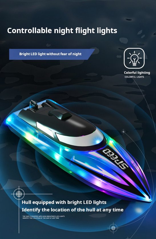 Volledig waterdicht: de verbeterde rompafdekking sluit beter af dan voorheen. De volledig waterdichte romp voorkomt dat er water binnenkomt. De interne motoren en printplaat zijn voorzien van waterdichte bescherming, wat betekent dat zelfs als er per ongeluk water in de boot komt, de boot nog steeds werkt nadat u hem hebt gedroogd.