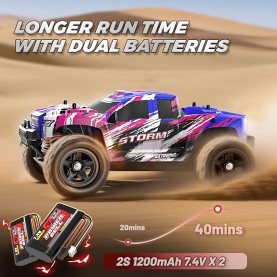 - Krachtige 4WD-aandrijving: Met vierwielaandrijving klimt deze truck moeiteloos over obstakels, door het zand en over gras. De metalen schokdempers zorgen voor een soepele rit op ruw terrein.