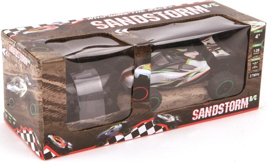 De Sandstorm is een 4-wheel drive RC buggy die klaar staat om er vandoor te gaan zodra je de doos opent. Maak je klaar voor deze blitse buggy met voor- en achteruitversnelling, 4-wheel drive, en een 2-kanaals 2.4 GHz radio. Uitgerust met een ruige polycarbonate carrosserie, met olie gevulde aluminium schokbrekers, batterij en oplader.