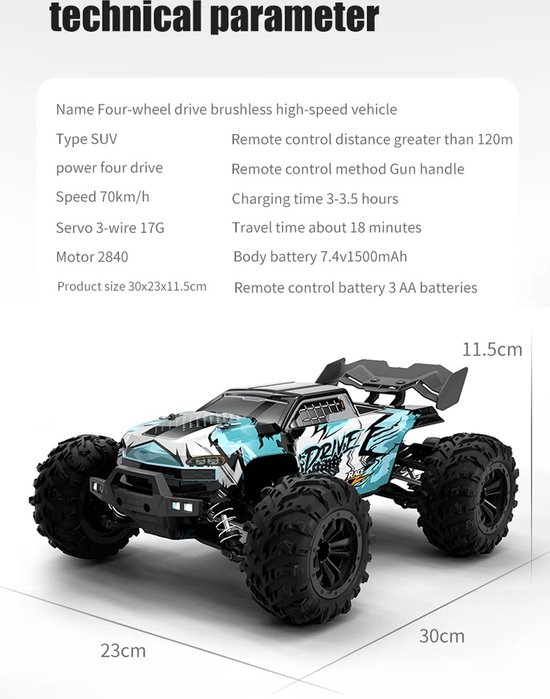 - **4WD Off-Road Monster Truck:** Ontworpen om elk terrein te veroveren, van modderige paden tot ruige rotsen. Het 4WD-systeem biedt stabiliteit en grip op alle ondergronden.