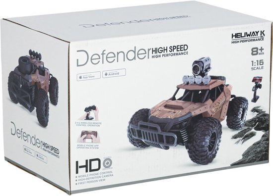 De stoere bruine carrosserie met daklampen, reservewiel, en gedetailleerde binnenkant maakt van deze RC-auto een echte eyecatcher. Zelfs kleine details zoals de schakelpook en luidsprekers zijn nagemaakt voor een realistische look.