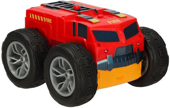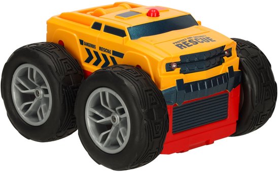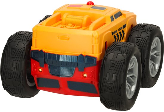 Dankzij de grote rubberen wielen van 7,5 cm en het slimme ontwerp met op- en neer bewegende wielen rijdt de auto probleemloos over obstakels en kan hij zelfs doorgaan nadat hij is omgevallen. Het voertuig biedt actief stuntplezier en is ideaal voor zowel binnen- als buitenspelen.