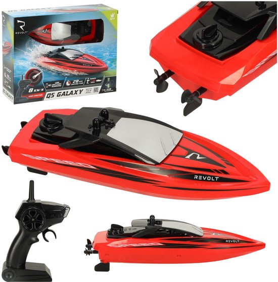 De SF Revolt Q5 Galaxy is de ideale op afstand bestuurbare boot voor jonge avonturiers en waterraceliefhebbers. Dit moderne en compacte model in fel rood bereikt een snelheid van 8 km/u en biedt tot 20 minuten speelplezier op een enkele lading dankzij de 3,7 V 650 mAh-batterij.