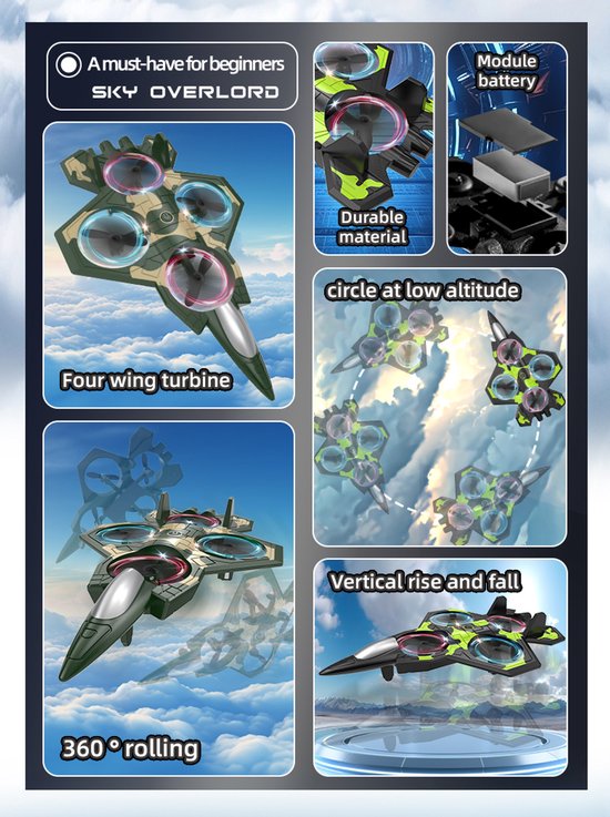 Ontdek de ultieme vliegervaring met de Sky Overlord Stunt RC Gevechtsvliegtuig Drone – speciaal ontworpen voor beginners en stuntliefhebbers! Dankzij het vier-vleugel turbinesysteem, de stabiele vluchtbesturing en de indrukwekkende luchtstunts is dit het perfecte toestel voor zowel binnen als buiten.