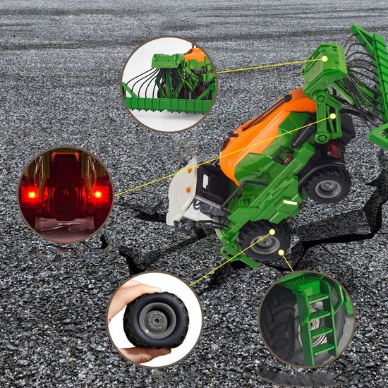 2. Meeslepende Licht- en Geluidseffecten: Verbeterde Speelervaring Uitgerust met een zeer realistisch geluids- en lichtsysteem, gaan de lichten aan wanneer je op de knop van de afstandsbediening drukt, waardoor ze direct de aandacht trekken in het donker. De tractor maakt realistische werkgeluiden wanneer hij vooruit rijdt en schakelt automatisch over naar een achteruitrijgeluid. Elke actie wordt begeleid door geluid, wat de speelervaring nog meeslepender maakt.