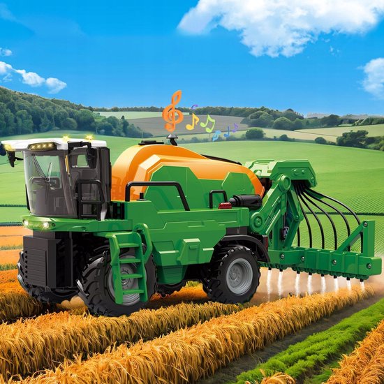 1. Gesimuleerde sproeifunctie: Een realistische boerderijscène Wordt geleverd met een waterreservoir en een waterfles, zodat kinderen handmatig water kunnen toevoegen. Door op de sproeiknop op de afstandsbediening te drukken, wordt een fijne sproeinevel geactiveerd, waardoor het proces van het aanbrengen van vloeibare mest op een boerderij realistisch wordt nagebootst. Dit laat kinderen niet alleen genieten van het plezier van een "kleine boer" zijn, maar biedt ook een intuïtief begrip van hoe landbouwmachines werken, en leren spelenderwijs.