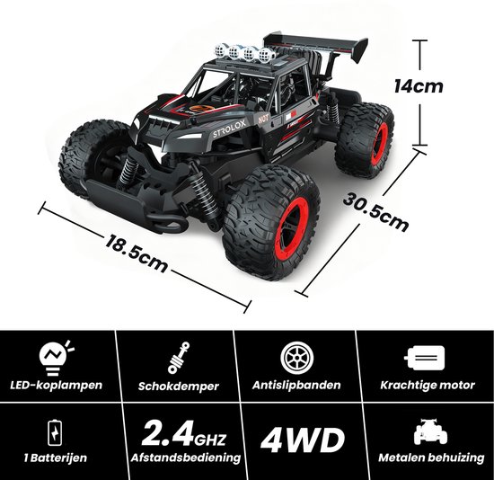 De Strolox® Shadow Chaser is gemaakt voor snelheid, avontuur en pure actie. Met zijn robuuste metalen body, krachtige motor en vierwielaandrijving (4WD) trotseer je moeiteloos stenen, zand en gras. Perfect voor jonge raceliefhebbers én volwassenen die houden van prestaties.