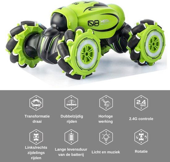 Draai- en stuntfunctie: De unieke draaifunctie stelt de auto in staat om spannende 360-graden salto's en spins uit te voeren, wat garant staat voor urenlang plezier en entertainment.