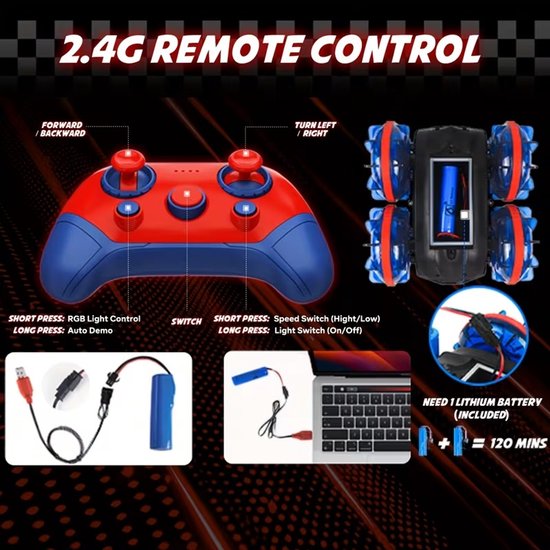 De UrbanStox AquaRacer X4 RC Stuntauto biedt spannende actie op land én op water. Dankzij het amfibische ontwerp, 4WD-aandrijving en 360° rotatie kan de auto moeiteloos rijden door modder, plassen, zand en gras. De stevige kunststof behuizing en all-terrain banden zorgen voor duurzaamheid en maximale grip. Met de meegeleverde twee 3.7V 1200mAh oplaadbare batterijen kunnen kinderen langer spelen zonder onderbreking. Ideaal voor jongens en meisjes vanaf 8 jaar.