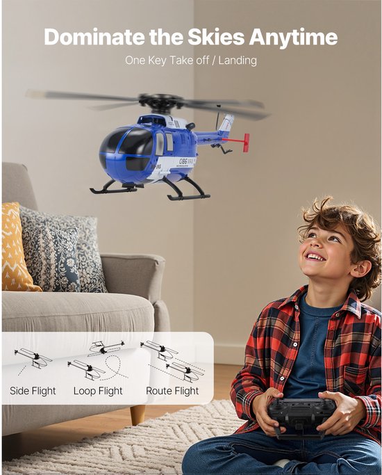 - Eenvoudig te bedienen: De RC-helikopter is voorzien van éénknopsbediening voor opstijgen en landen, waardoor vliegen zelfs voor beginners gemakkelijk is. Extra functies zoals zijwaarts vliegen, zweven en over land vliegen bieden nog meer vliegplezier.