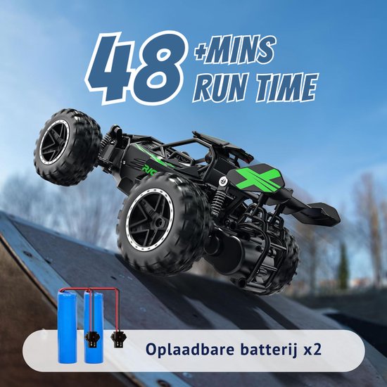 Batterijen: RC-auto werkt op oplaadbare accu (meegeleverd), afstandsbediening werkt op 2 AA-batterijen (niet inbegrepen)