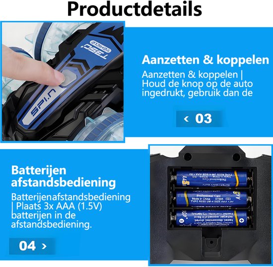 - Functies: 360° rotaties, flips, LED-wielen, waterdicht ontwerp