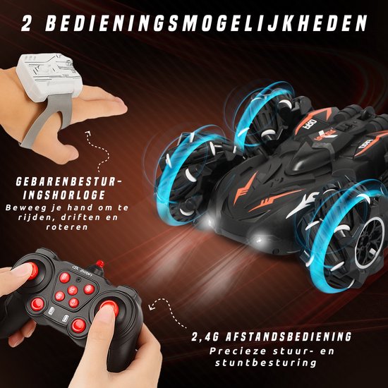 Maak je klaar voor een nieuwe generatie stuntplezier. Deze RC drift auto verandert elke rit in een show vol acties. 360° spins, soepele drifts, verbluffende flips en krachtige offroad grip maken dit racemonster een echte blikvanger. Met zowel een afstandsbediening als een polsbesturingsarmband bepaal jij hoe de race verloopt.