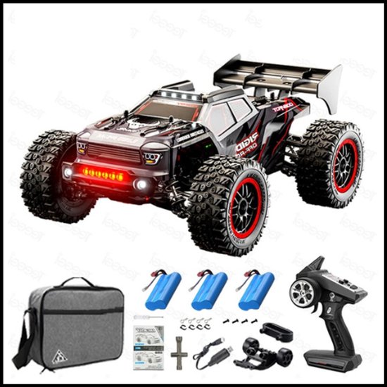 De auto beschikt over een volledig 2.4G gesynchroniseerd afstandsbedieningssysteem, metalen tandwielen en CVD-aandrijfas, onafhankelijke vering, LED-koplampen met drie modi, grote simulatiebanden en een hoogwaardig PVC car body dat explosiebestendig en duurzaam is. Met een gewicht van 1 kg en een werkduur van circa 30 minuten per volledige lading is dit een krachtige en robuuste RC-auto voor kinderen en RC-liefhebbers.