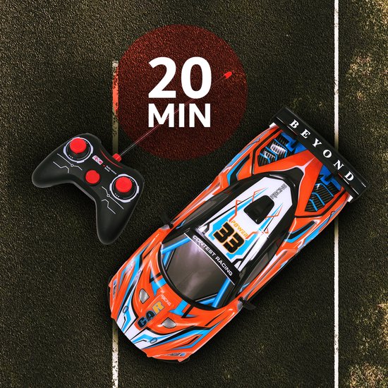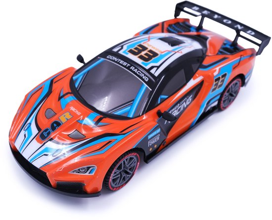 Vrooooom, lights out and here we go. Met deze geweldige sportauto met Remote Control beleef je urenlang raceplezier. De afstandsbediening heeft 4 kanalen. Dat betekent dat je voouit, achteruit, links en rechts kunt rijden en sturen. Heeft je sportauto een afwijking in de voorwielen? Geen probleem, de voorwielen kun je op de onderkant van de auto bijstellen. Voor extra beleving beschikt de auto ook over koplampverlichting tijdens het rijden.